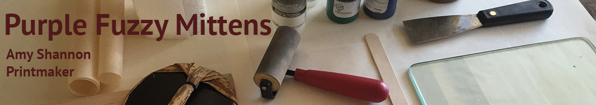 Welcome to the home of Purple Fuzzy Mittens. This site is occasionally slow to update because, naturally, it is way more fun creating art than working on a web site. For the last couple of years I have been up to my elbows in inkiness. You can see many of the resulting prints on the Gallery page. To learn about how you can purchase prints, check out the About page. All of my prints are original hand-pull (hand carved, inked and burnished with a barren) prints. Nothing digital here, except the web site!