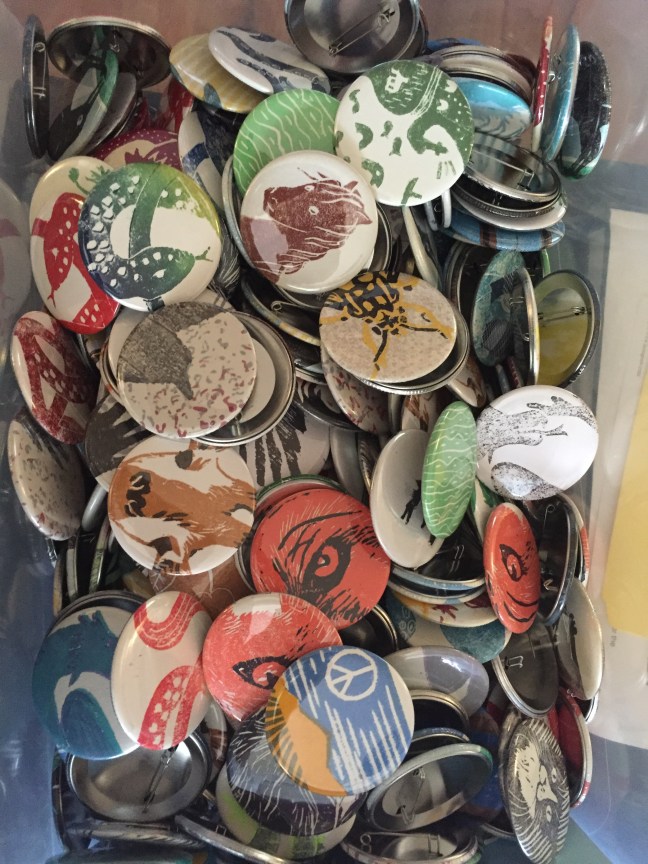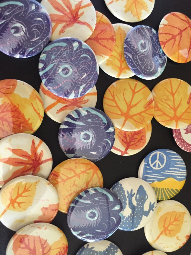 I’ve created another batch of pins from bits and pieces of woodcuts. The autumn leaves are from a large print that I was never satisfied with, so I cut them up. The squid are my fovorite pins yet. They have all been added to my box of pins for sale (except for one squid that I am keeping to wear).