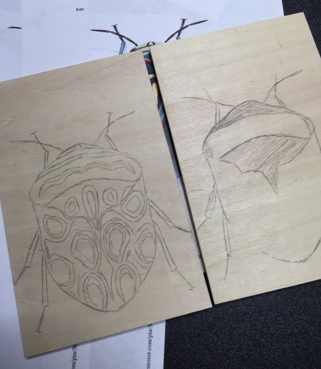 Even though I have not added any new prints to the gallery lately, I have been busy. A primary activity has been to improve my workspace with a sturdier (safer) place to carve blocks. I have also been stockpiling design ideas, and have a record number (for me) of blocks in progress – about a dozen designs queued up for carving. On the business end of things, I can now take online credit card payment. As a sneak preview, here is a bug block in its early stage. It’s a very colorful African insect called a Picasso Shield Bug.