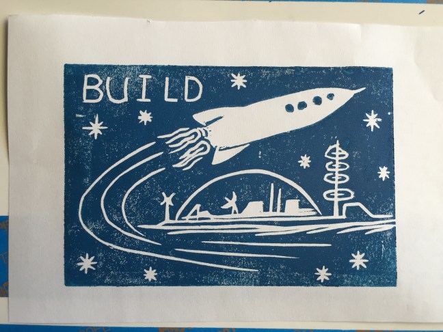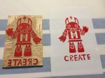 I am busy getting ready for my first public event. the Reno Mini Maker Faire is July 9th at Idlewild Park in (you guessed it) Reno from 11am-5pm. Since it is a hands-on maker event, anyone who comes to my booth will be able to roll out the ink and make their very own special-edition print. I’ll also have lots of prints available for sale. Lots to do before then, including carving 3 blocks just for the event. This one has the Maker Faire robot logo. Hope to see you at the Faire!