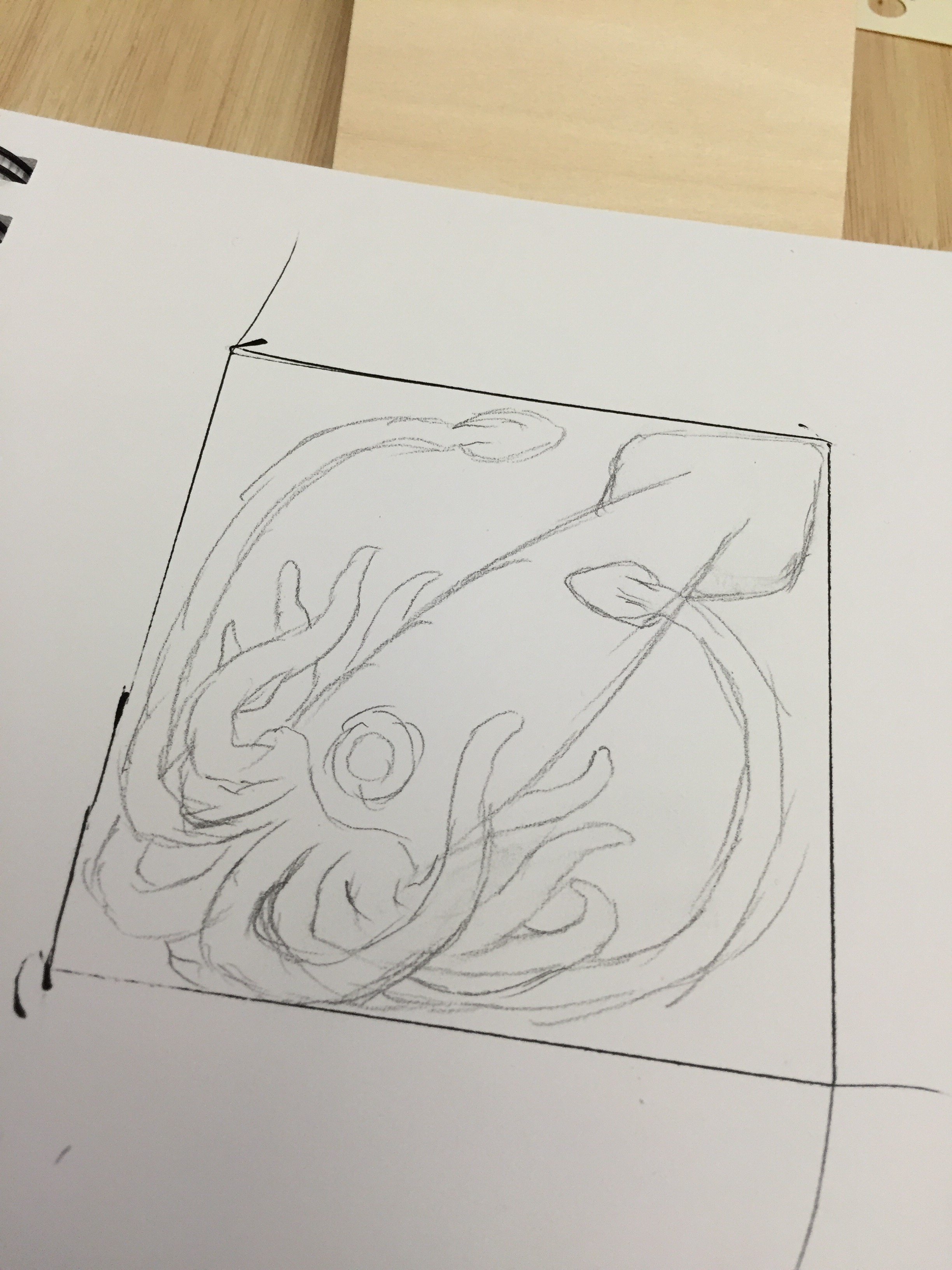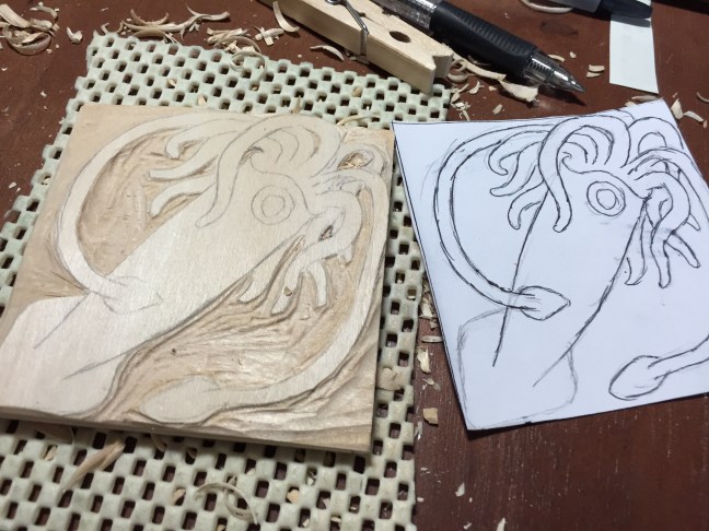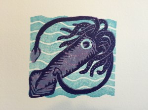 I’m always happier with prints if I wait 24 hours before judging them. Perhaps my perspective is a bit broader then and I can view the print as a whole (rather than focusing on details). Or perhaps it is just further from my initial expectations. After the 24-hour gap, I reassessed the squid print and decided not to add another layer. So Squid are now available for purchase. I have also added a print called “Family” that somehow got left off when I set up the gallery page. This linocut print was one of my early prints, created for my niece Jessica’s wedding.